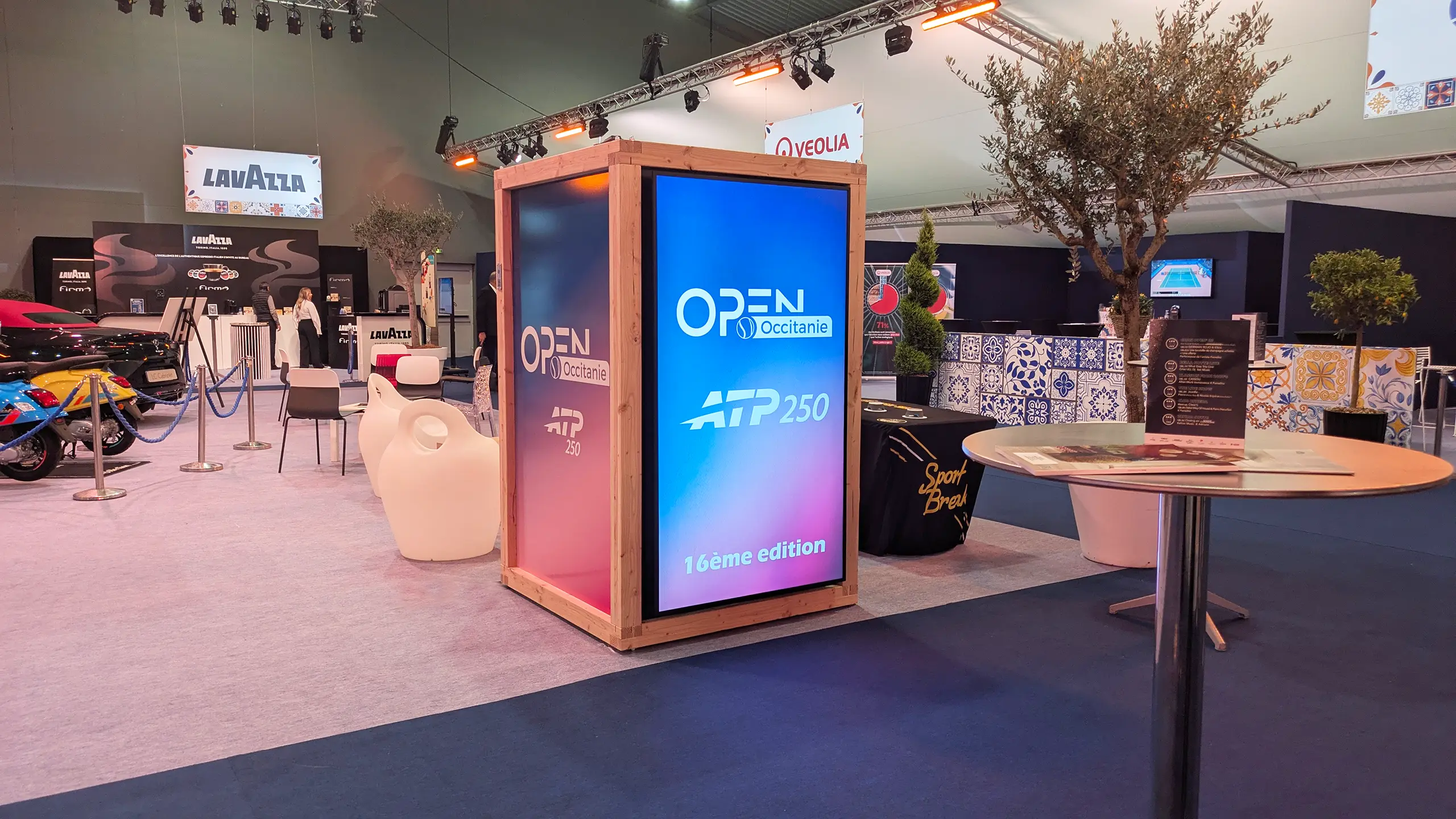 Écran intégré dans une structure en bois massif, disponible en deux options : a vec une zone imprimable en dibond sur la partie inférieure pour une personnalisation selon votre identité visuelle, ou s ans personnalisation.